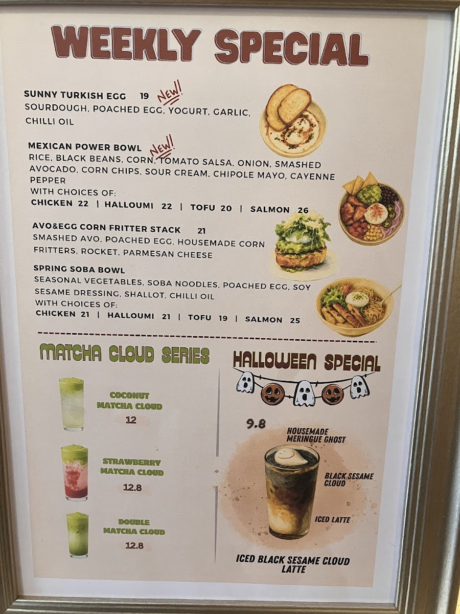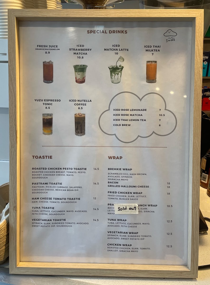 Drinks: The beverage offerings include a variety of specialty coffees such as flat white, iced latte, and hot matcha latte with oat milk, along with tea options like rose flower tea and peppermint. There are also unique iced drinks including iced strawberry matcha, iced matcha latte, yuzu espresso tonic, iced nutella coffee, and iced Thai milk tea. Fresh juices are also available.